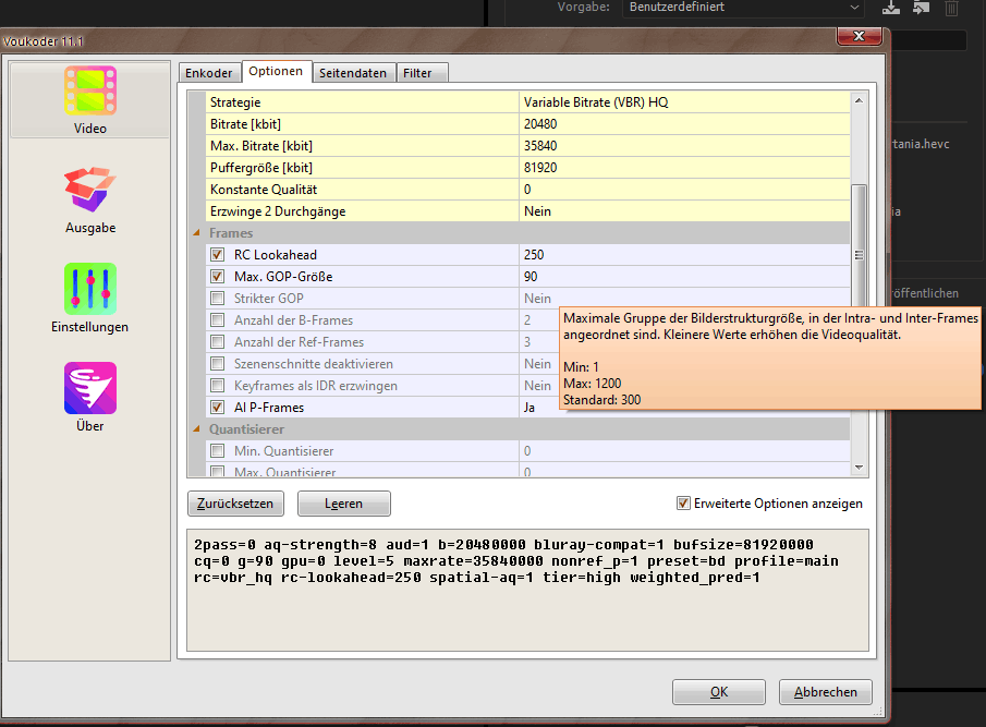 In the line "max. GOP size" there is a claim "the shorter the GOP the better the quality". This is not true! Intra frames are the biggest and therefore the most "expensive" frames in the stream. A short GOP will increase the size at given quality or reduce the quality at given file size. So it would be better to insert more smaller P & B-frames between the I-frames which means a long GOP.