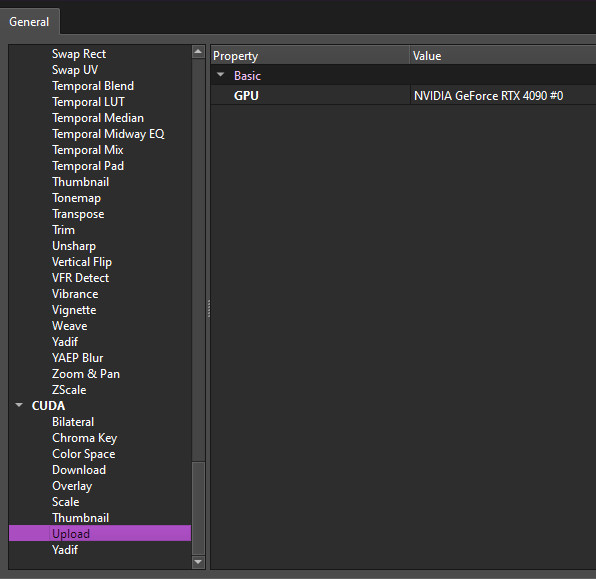 Testing on a 2-GPU system, VoPro version 0.7.2.8, Vegas 20 build 411. GPU was assigned by setting the target GPU in the CUDA Upload filter.