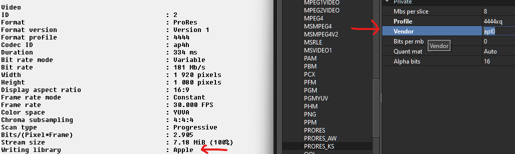 3) Fix the vendor tag to properly reflect what is defined in the prores_ks encoder (apl0 in my case)
