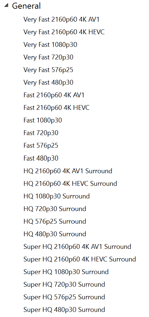 I'd like to see a wider selection of presets or scenes pre-installed by default to have a wider range of examples on how a good preset is built up. Perhaps an equivalent variety to what Handbrake has in the General and Professional sections, but maybe not quite as many in total?