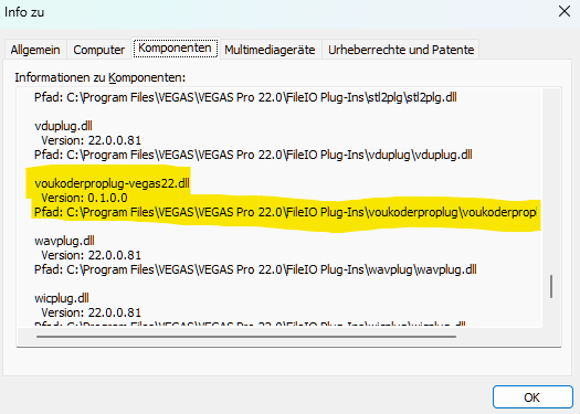 Looking at "C:\Program Files\VEGAS\VEGAS Pro 22.0" I see the file "VoukoderProVEGAS22-x64.fio2007-config" so I assume that means that the "connector" was installed properly.