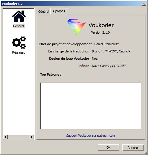 The list of Patrons is empty with Voukoder 2.1.0