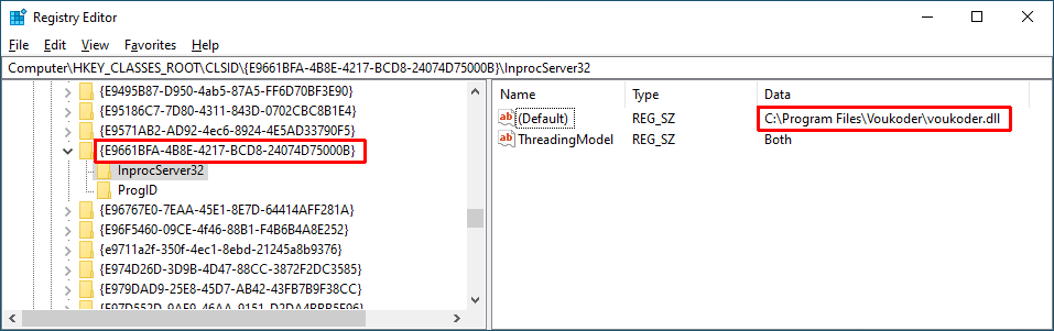 The voukoder.dll should be installed to an independent directory (i.e. the default one). It gets registered as a COM server then. In the registry it should look like this :