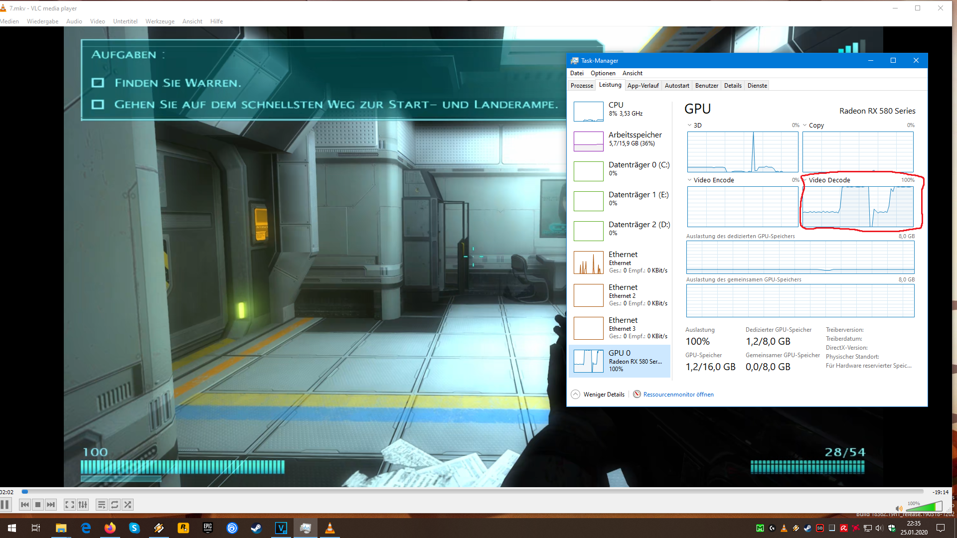 Mir ist aufgefallen dass im Taskmanager bei der Grafikkarte der Punkt "Video Decode" in der Zeit in der das Video hängt auf 100 % läuft (s. Anhang).