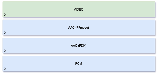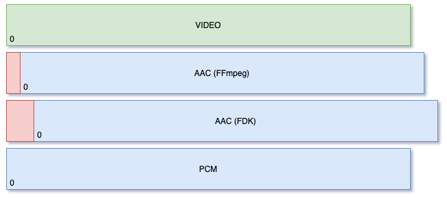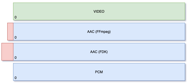 If you take a closer look you notice that tracks encoded with AAC have a delay of a multiple of 1024 samples. Usually AAC encoders produces an offset of 1024 samples (or 21.33 ms at 48 kHz) and the FDK-AAC encoder adds an offset of 1024 samples per channel (like 42,66 ms for stereo at 48 kHz).