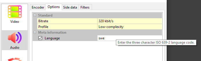 I hope I have a fairly simple question that migt be resolved already in the x264 commad line, or in a filter. All our mp4 exported today from Adobe Premiere gets the english language tag. And there is no way to change this. We nee to be able to control the language tags and be able to export an mp4 file with for example a swedish language tag, or spanish or what ever.