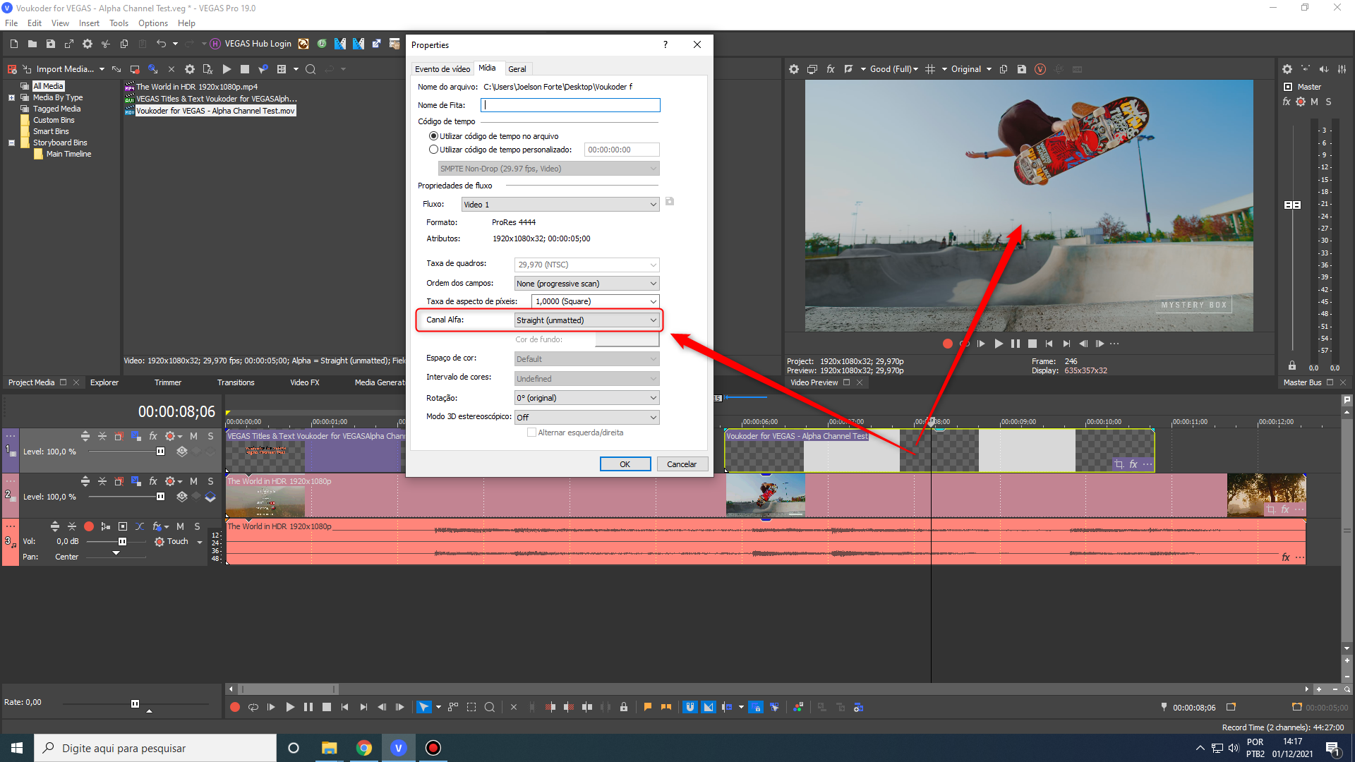 In this project I created a ProRes file with alpha channel which is correctly recognized in VEGAS Pro 19.