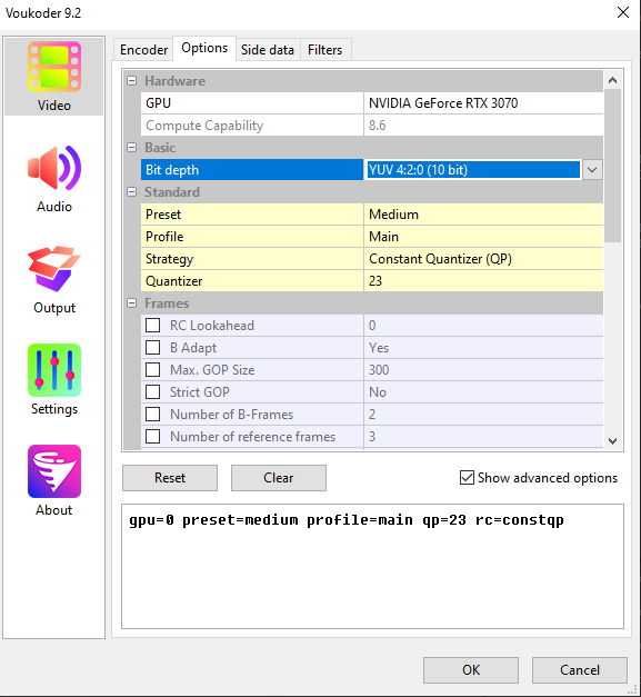 [10:47:14] Options: _computeCapability=8.6 _pixelFormat=p010le gpu=0 preset=medium profile=main qp=23 rc=constqp