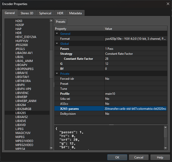 Anyway, one of these tests would involve HDR content, and in order to do that I am using setparams to set color space values. For my tests that's enough for now, but if I ended up using this workflow for my full projects, I'd need to make use of the "Mastering Display" and "Content Light Level" sections of the Side Data tab, as NVENC doesn't have its own sections for those settings like x265 does.