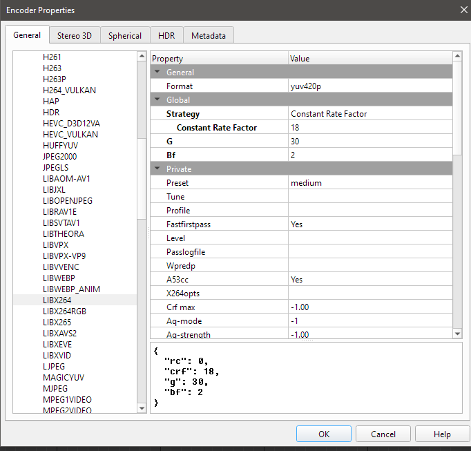 You can see the options listed in the "Video" file, encoding via LIBX264, basically stock. Generally I'd mess with it more, but I wanted to just do the bare minimum of changes. "Audio" is just straight-up AAC, CBR 320, low complexity. The MP4 output has the faststart flag set.