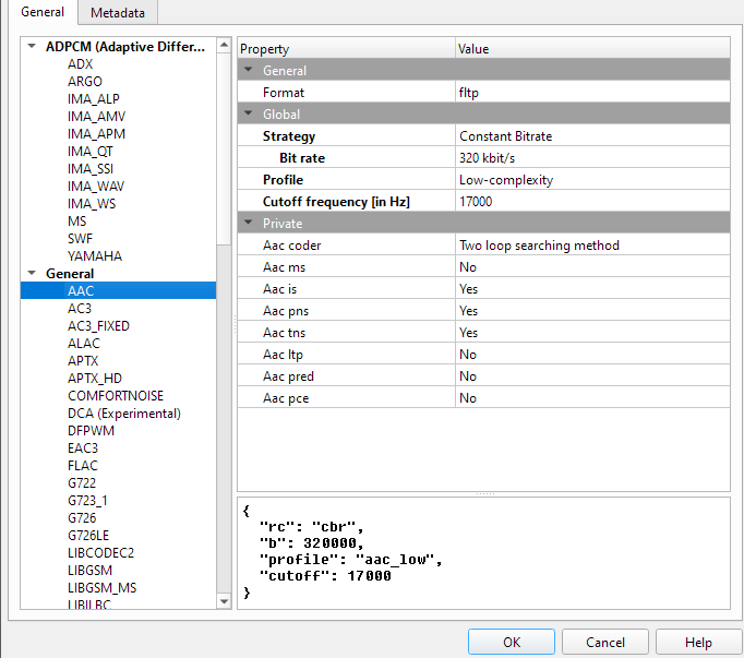 Audio Encoder: AAC (General), CBR 320 kbps/s, Low-complexity, Cutoff 17000 Hz