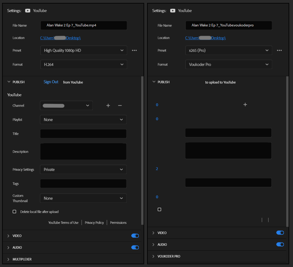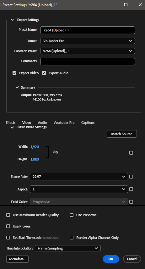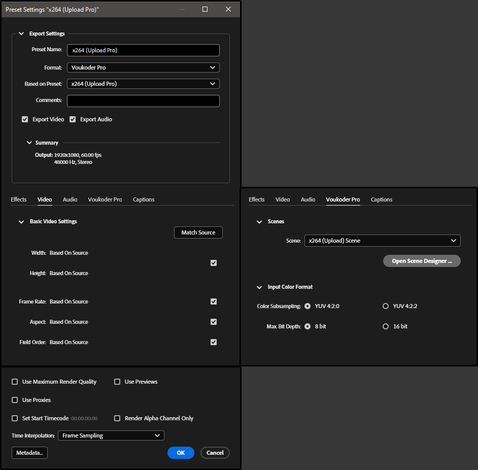 And now the horror that is Adobe presets. I tried to capture most of it in the "Fill size preset" image (Premiere is being a bitch and adding "_1" to the end of all my presets). This is just showing that I'm not doing anything weird except that I forgot to set the framerate to 60 for the screenshot. The "Smaller preset" image is the Voukoder Pro tab, I just left the color options alone.
