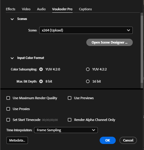 The UI works fine (amusing, sometimes the built-in ones don't, but switching to a Voukoder preset fixes it), however, sending it to "Media Encoder" or just directly "Exporting" it causes...nothing. The preview UI goes blank, and it just kind of sits there. Toggling to another preset and back fixes to UI again, but it's the same behavior. I've tested this with exporting just as a Media file, and that works perfectly, either direct or queued.