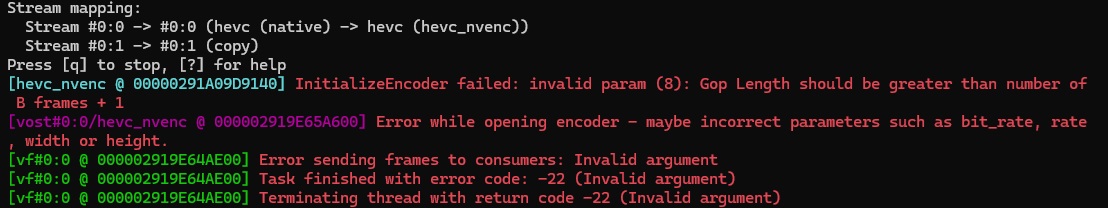 3 Should incl bframe setting (-bf:v) to overwrite default "3", otherwise nvenc_hevc fails. Valid values for "-bf:v" are 0,1,2 (IPP,IBP,IBB)
