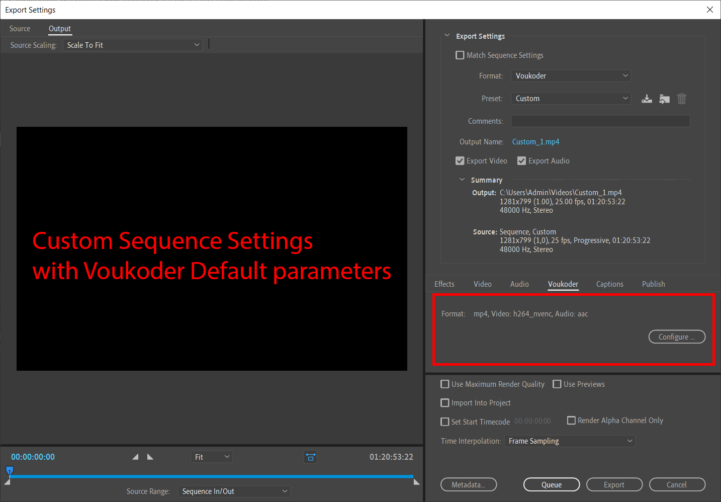 Settings of voukoder are default. This problem was in both version 4 and version 5.